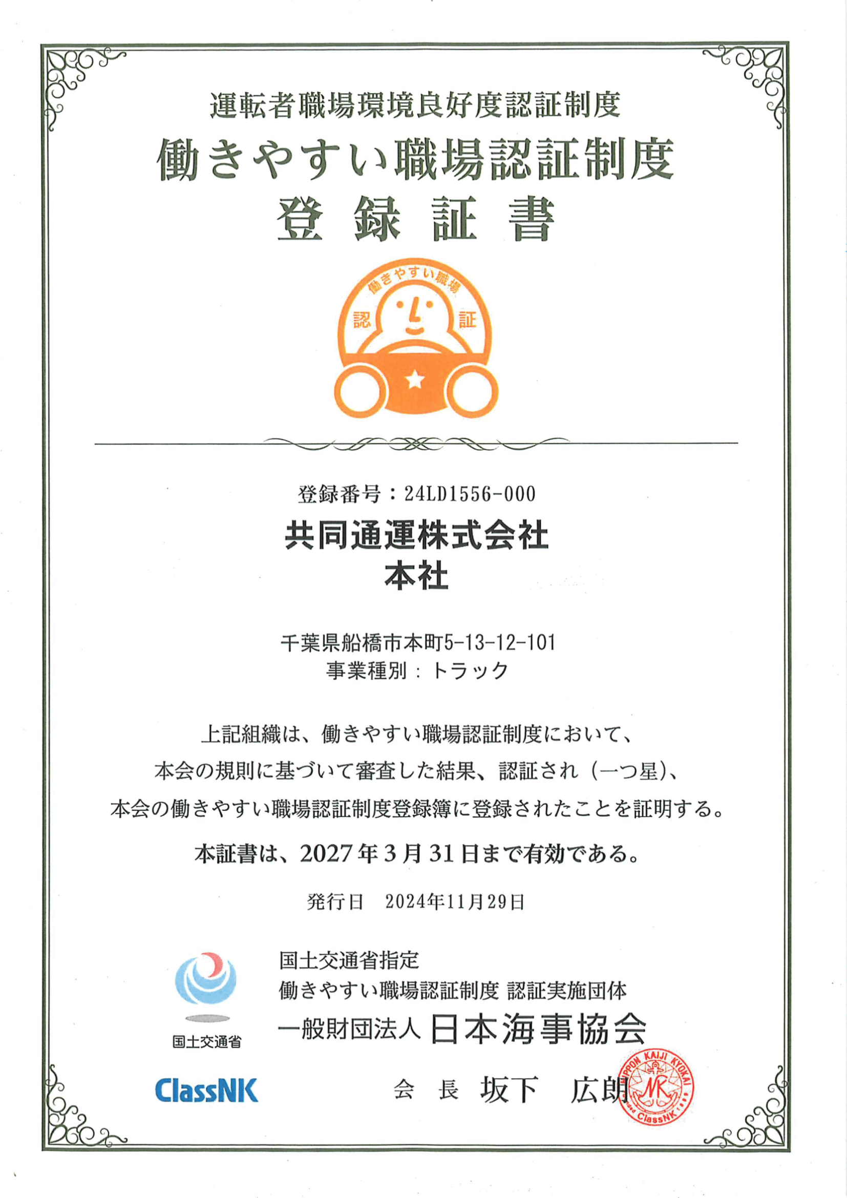 当社は、全日本トラック協会より「安全性優良事業所(Gマーク)」の認定を受けております。これは、交通安全対策への取り組みや法令遵守状況が一定の基準をクリアした事業所にのみ与えられる、安全性の証です。今後も「安全」を最優先事項とし、お客様に安心をお届けする物流品質の維持・向上に努めてまいります。